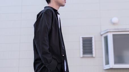 カフスボタンもつけず、フロントボタンも2つ留めるくらいで少し肩を落としてゆったりと着たい。